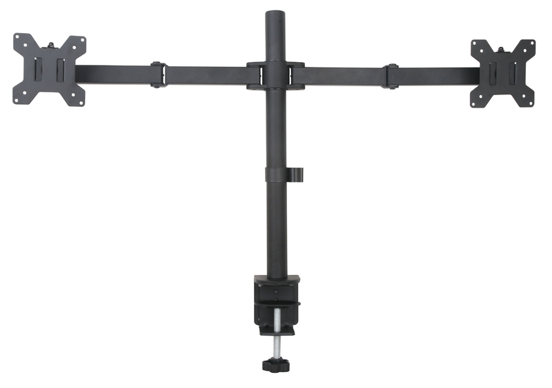 ITEM DESCRIPTION: The mount is made of high grade steel and aluminum. Fits most LCD monitors 13" to 32". Supports up to 18 lbs per monitor. Every joint is able to be tightened, so you can adjust exactly how fluid/stationary you want everything, simply remove the cap on the joint and tighten the bolt underneath. Mount uses VESA 75 x75 & 100 x 100 mounting holes. Key Measurements: From the desk to the top of the center post is 14.5". The distance between the square brackets that the LCDs mount to is 31" (on center) when full extended. Features: - Tilt: -15 to +15 degree - Swivel: 360 degree - Rotate: 360 degree - Height adjustable - Ultra heavy duty "C" clamp - Integrated cable management system - Monitor can be installed either in portrait or landscape shape - Fully adjustable arms