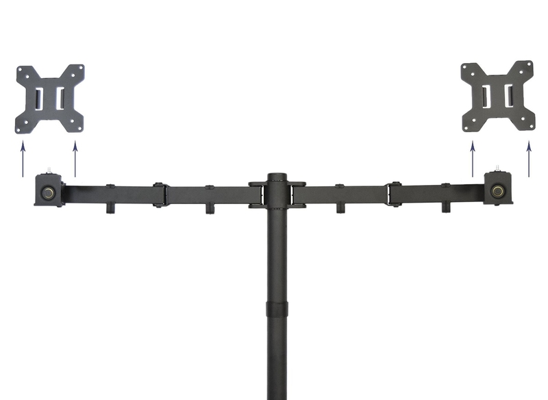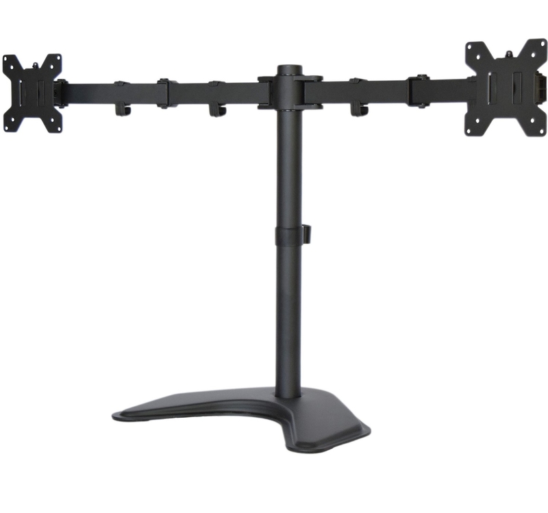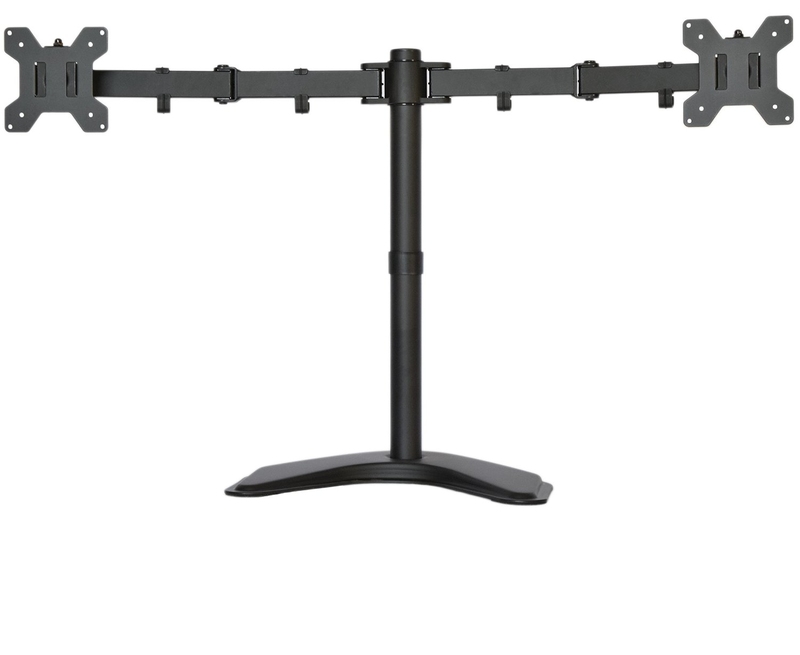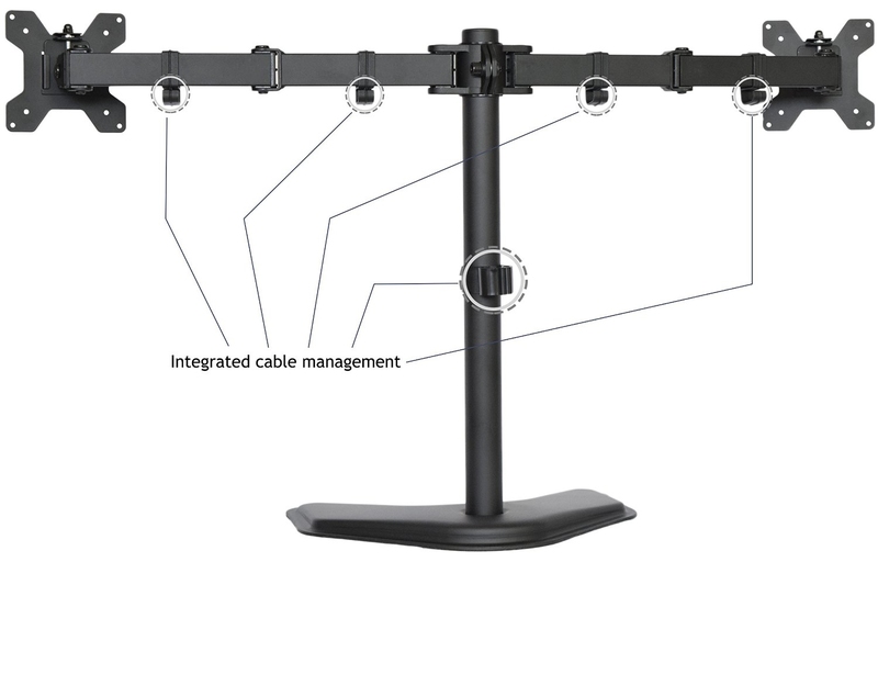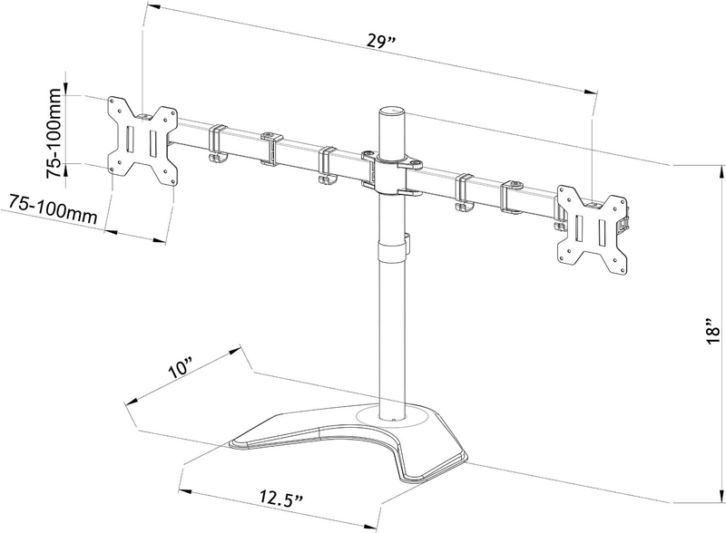 The mount is made of high grade steel and aluminum. Fits most LCD monitors 13" to 24". Supports up to 22 lbs per monitor. Every joint is able to be tightened, so you can adjust exactly how fluid/stationary you want everything, simply remove the cap on the joint and tighten the bolt underneath. Mount uses VESA 75 x75 & 100 x 100 mounting holes. Feature: - Tilt: -15 to +15 degree - Swivel: 360 degree - Rotate: 360 degree - Height adjustable - Integrated cable management system - Monitor can be installed either in portrait or landscape shape - Fully adjustable arms Key Measurements: From the desk to the top of the center post is 19.5". The distance between the square brackets that the LCDs mount to is 24" when full extended, and that is center to center
