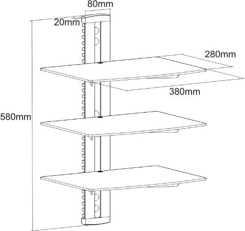 Wall mount shelve for audio / video components such as a DVD player, Blu-Ray player, Video Game Console, Satellite box, cable box or other. Supports up to 17.6 Lbs or 8 Kg per shelves. Shelve are 38 x 28cm (15 x 11 inches). 3 tempered glass shelves black (Can't see thru) 5mm thick. Cables Organizer integrated. The shelve can be fixed with screws. Hardware included. Easy installation.